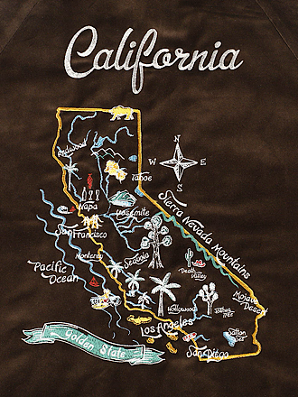 別珍とサテンのリバーシブル仕様で、別珍面は平和で穏やかな雰囲気のカリフォルニアをイメージし、フロントにはハミングバード、バックにはカリフォルニアマップを刺繍。